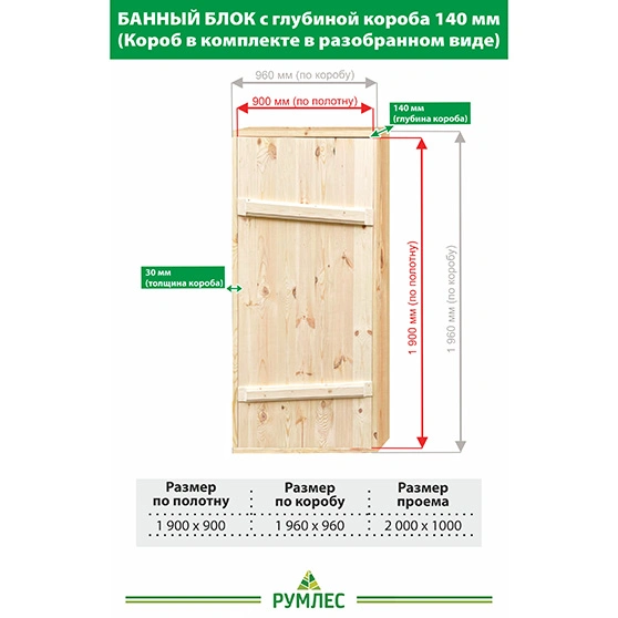 Дверной банный блок изготовлен из хвойных пород древесины. В комплект входит дверное полотно и короб. Ручки и петли приобретаются отдельно.
