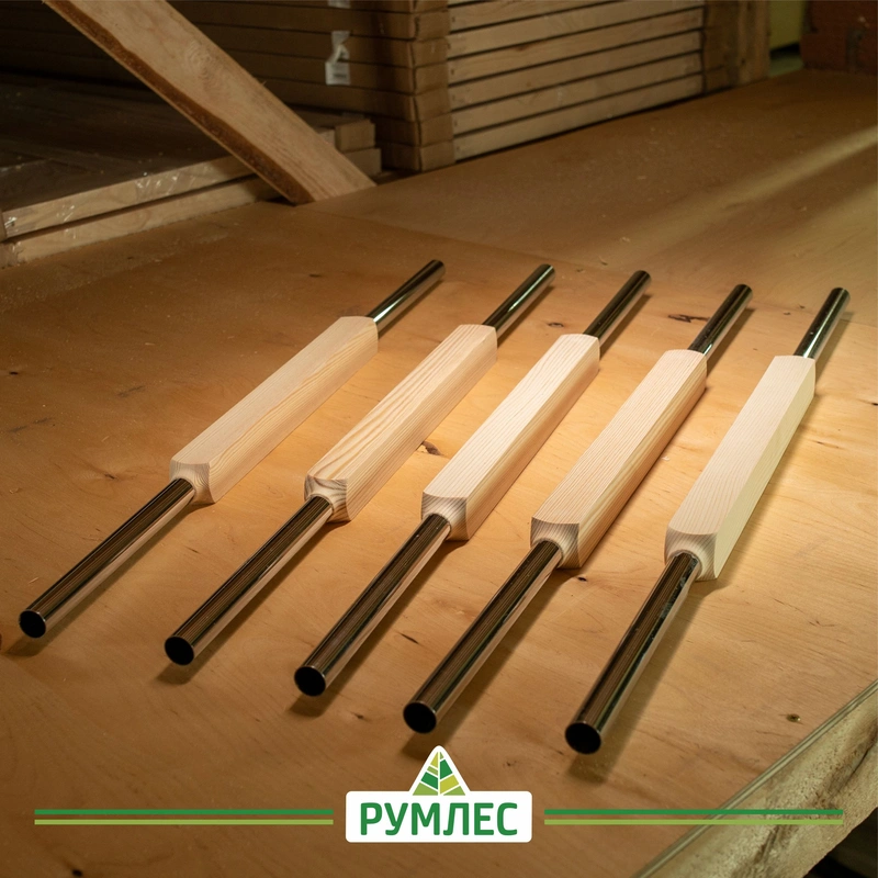 Комбинированная балясина состоит из хромированной трубы Ø 25мм и деревянного элемента из сосны. Снизу балясина крепится с помощью фланца, сверху к поручню — на специальное крепление.