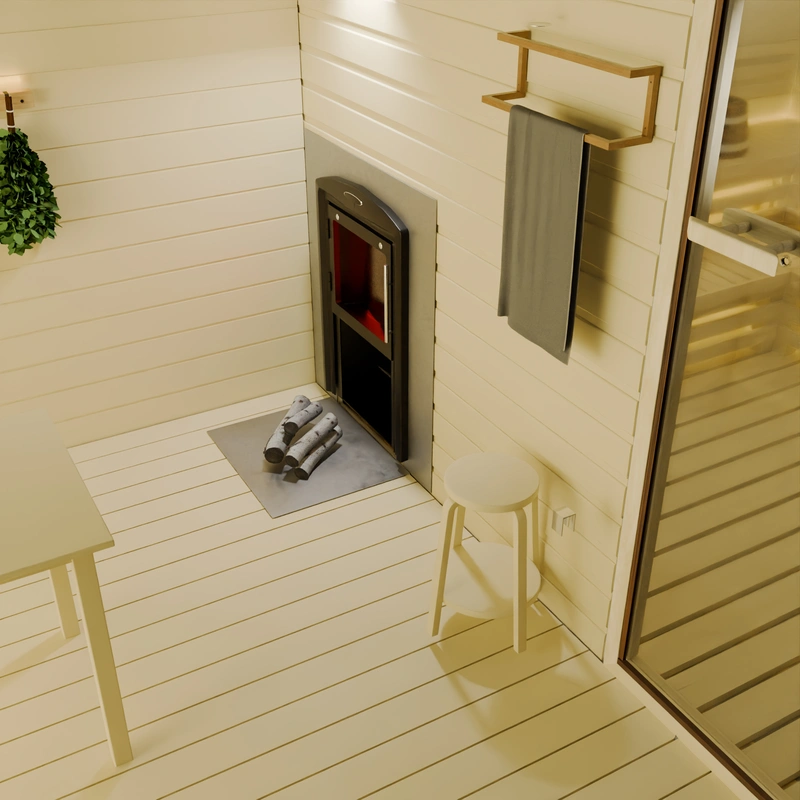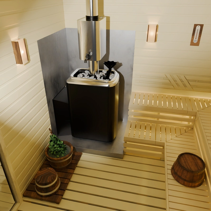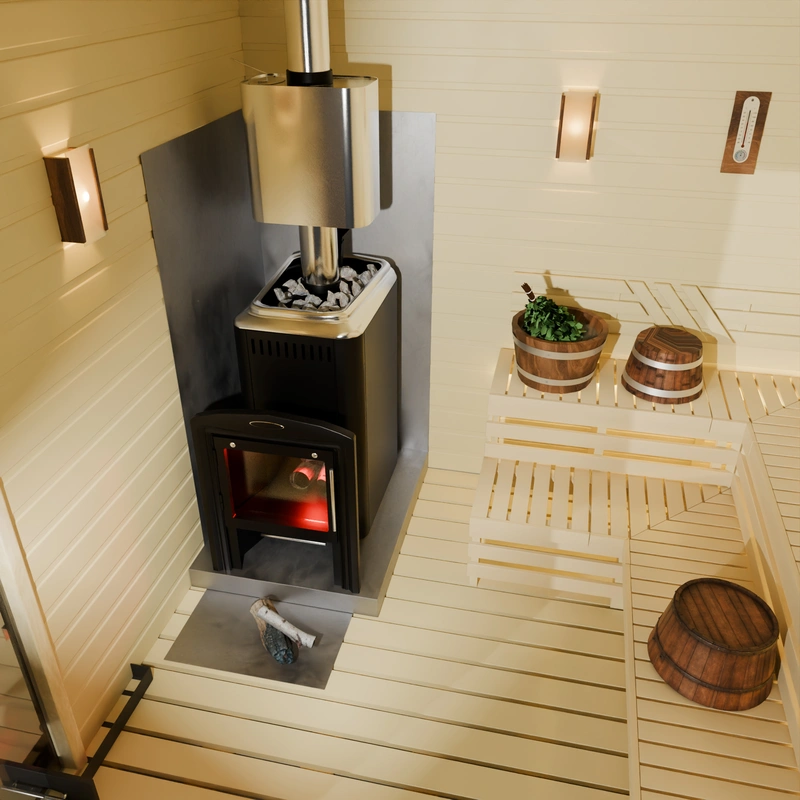 - Две каменки — закрытая и открытая — последовательно образуют пар нужных кондиций и позволяют регулировать режим от традиционной русской бани до финской сауны.