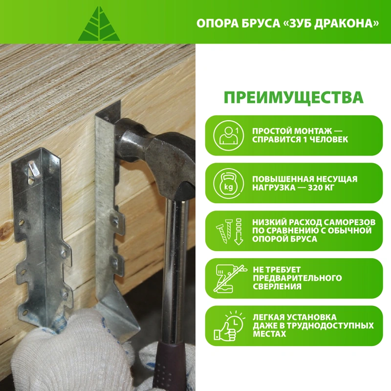 Опору бруса «Зуб дракона» рекомендуется крепить на конструкционные саморезы для перфорированного крепежа или ершеные гвозди.