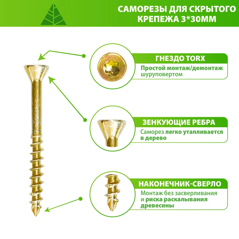 - Зенкующие ребра на шляпке крепежа обеспечивает утапливание самореза в древесину.