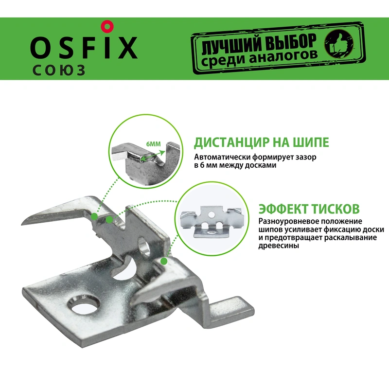 Крепеж OSFIX Союз предназначен для скрытого монтажа террасных и палубных досок толщиной от 22 мм. Крепление выполнено из гальванически оцинкованной стали толщиной 2 мм, устойчивой к коррозии.