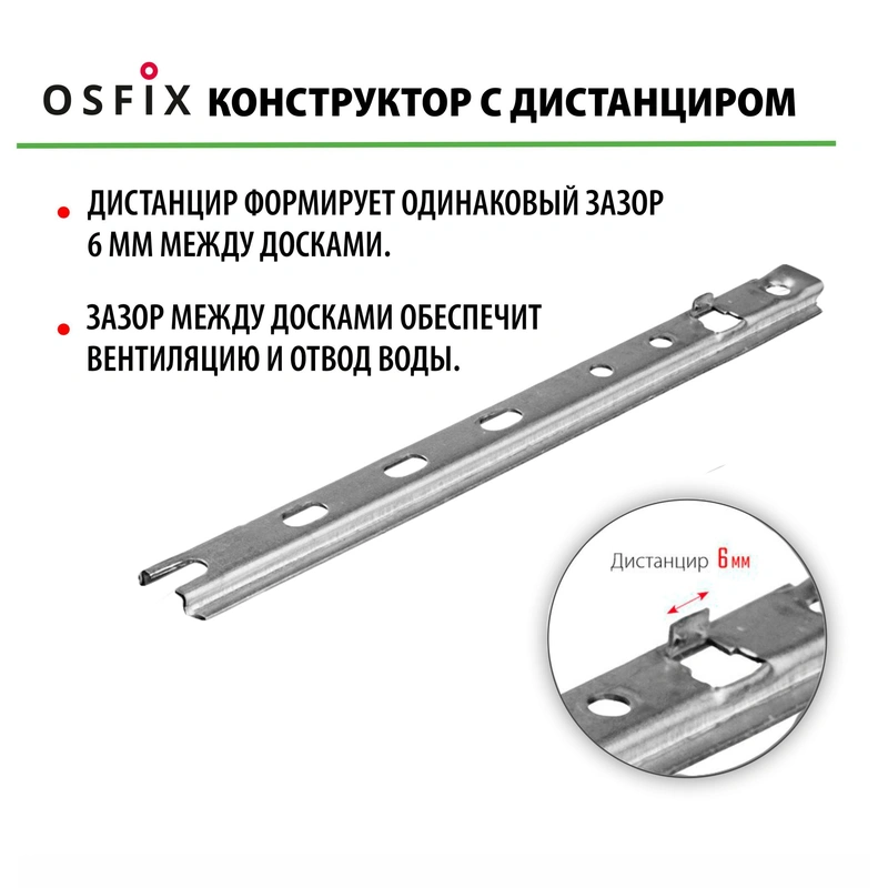 - Дистанцир создает автоматический зазор в 6 мм между досками, который обеспечивает вентиляцию воздуха и отвод воды.