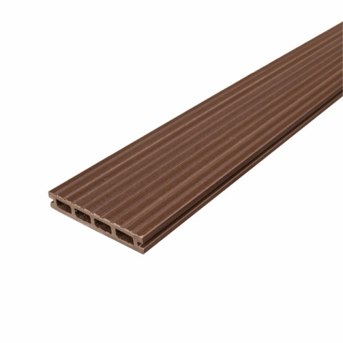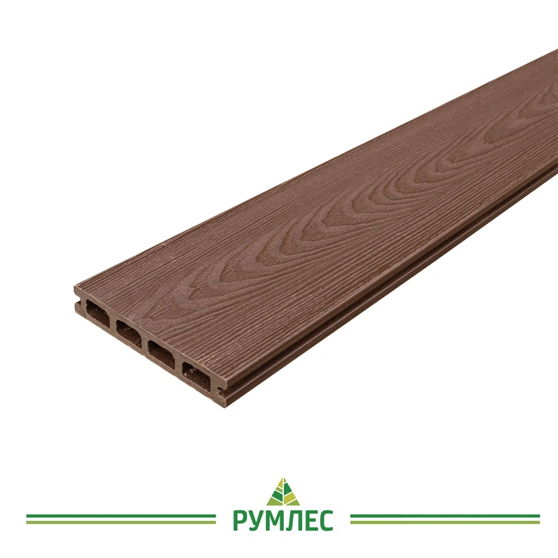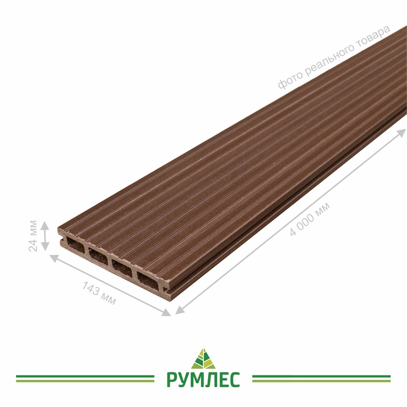 Террасная доска из ДПК — это современный материал из смеси древесных волокон и полимера. Одна сторона изделия гладкая, другая — рифленая. Укладывать доску можно как ровной, так и ребристой частью вверх.