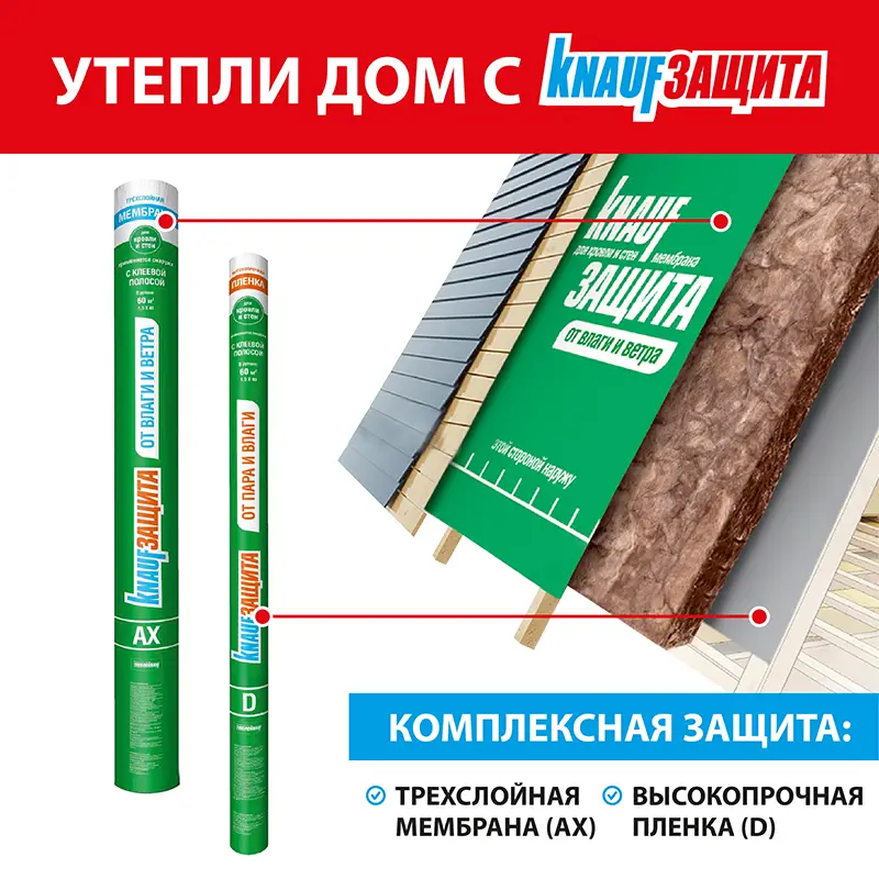 Пленка гидро-пароизоляционная KNAUF Защита D одновременно является гидроизоляционной и пароизоляционной пленкой. При использовании в наружных работах — защищает от влаги, при использовании внутри помещения — не пропускает пар.